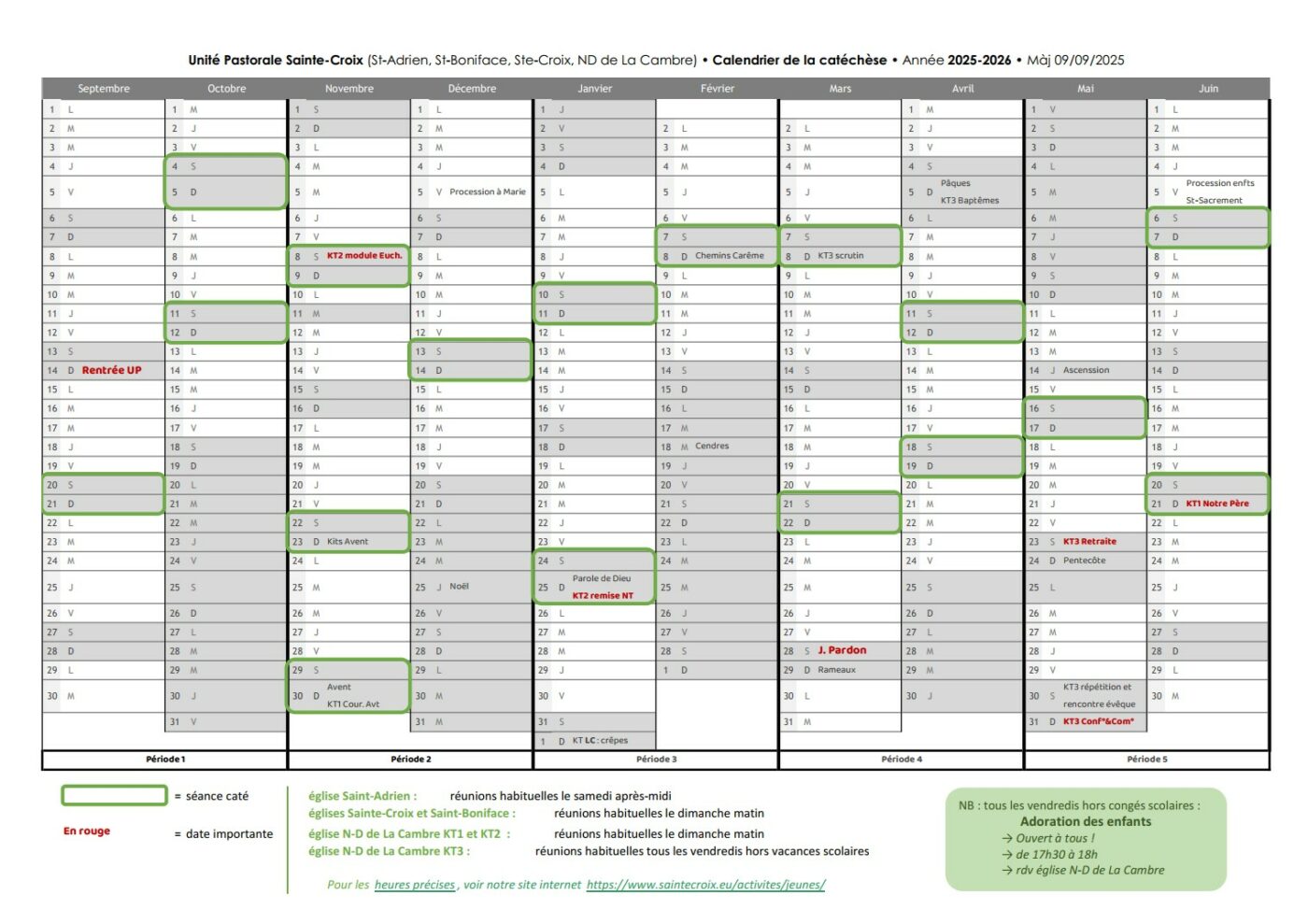 Téléchargez les dates des RDV de catéchèse en pdf : sous forme de calendrier, ou sous forme de liste (une page par église).