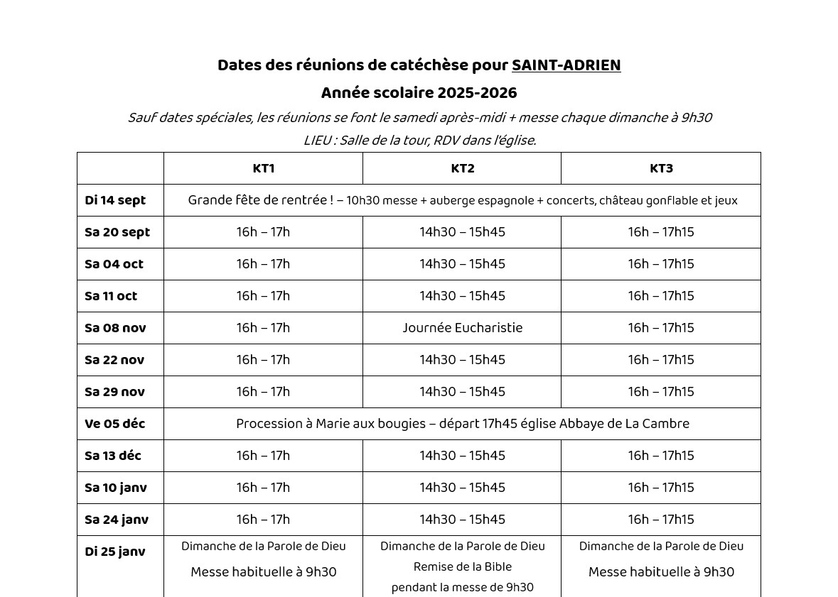 - KT2 (àpd 8-9 ans, 3e primaire) : en cours d’année, journée eucharistie ; célébration de la remise de la Bible ; et 1e Réconciliation.